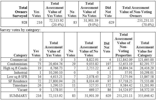 Here are the survey results: 216 yes responses, 83 no responses. We had a 30% response rate from residential properties.